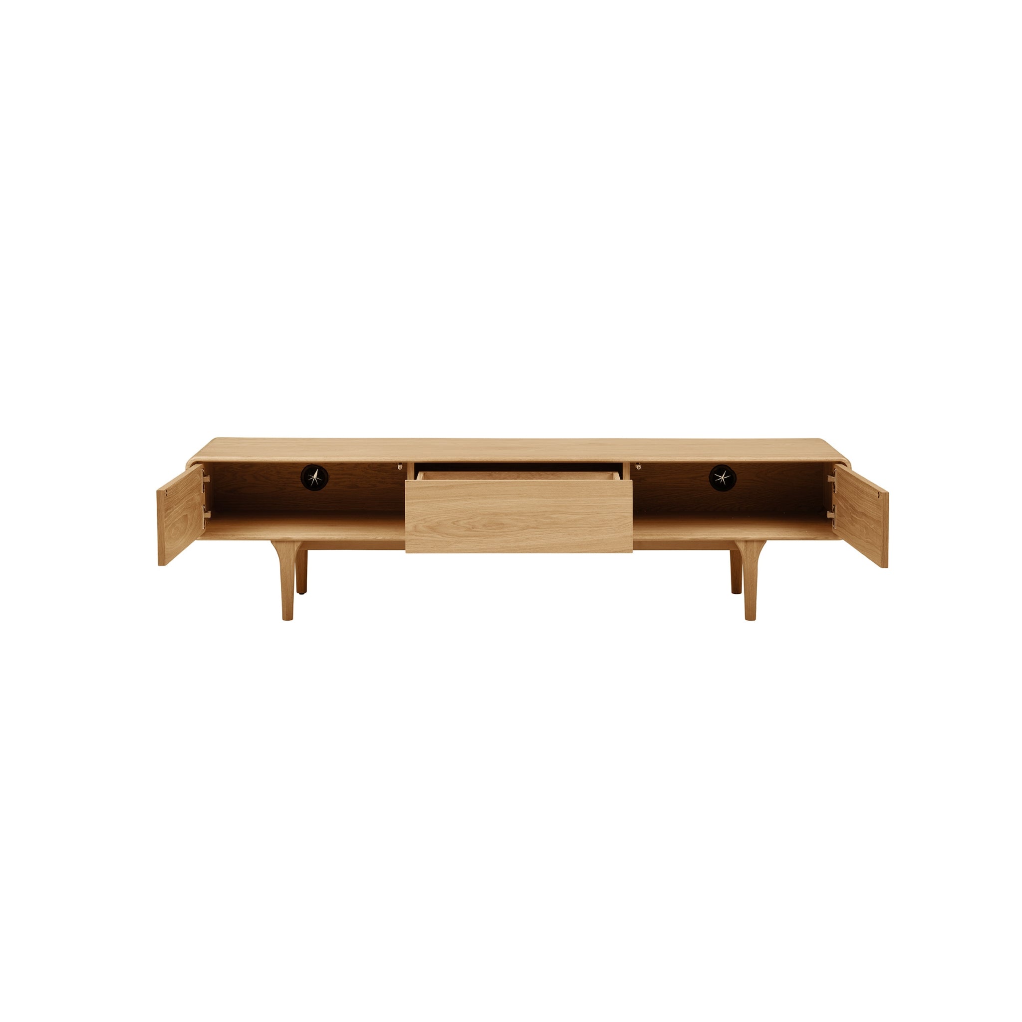 Ge ditt vardagsrum en tidlös och naturlig känsla med Darwin TV-bänk i ek. Den breda designen på 180 cm gör den idealisk för stora TV-apparater och ger samtidigt gott om utrymme för mediautrustning, dekorationer och förvaring.