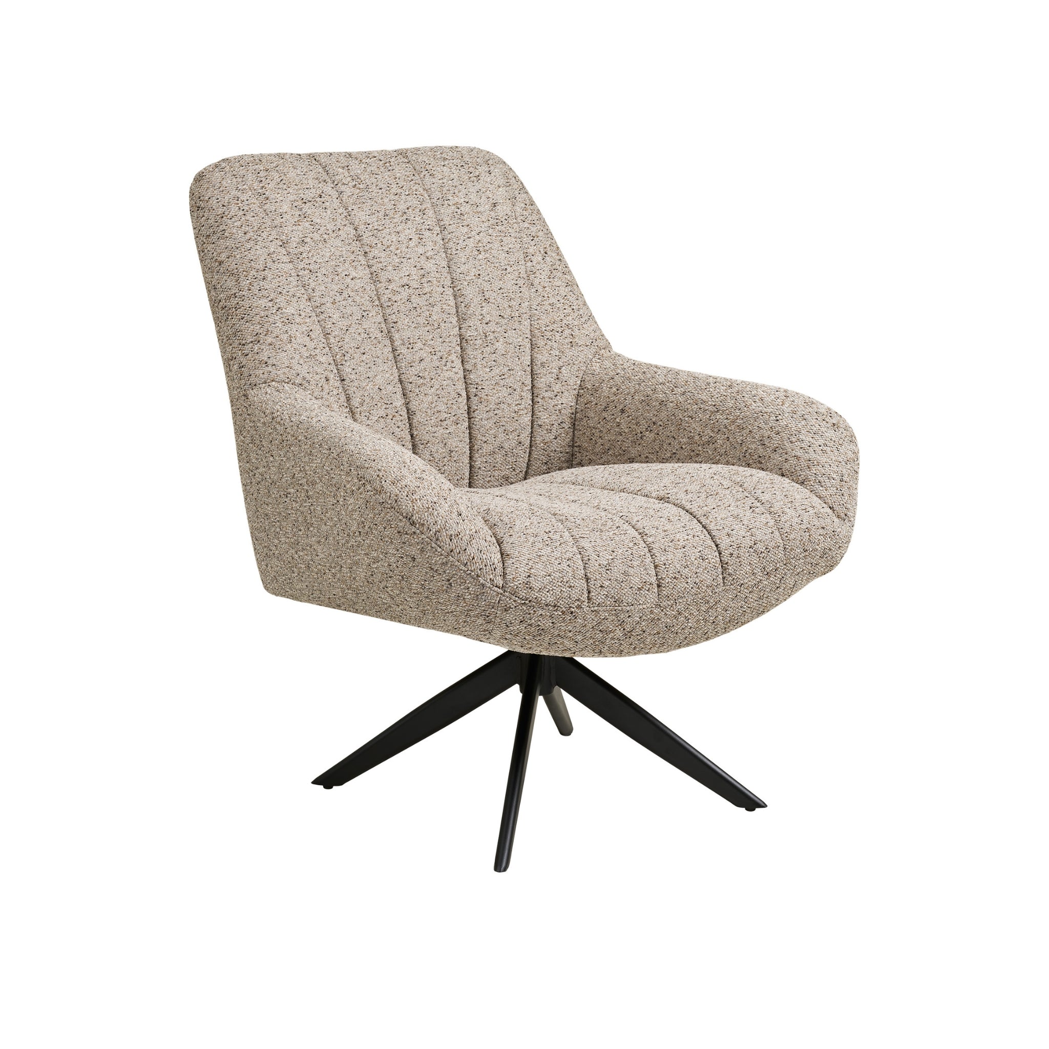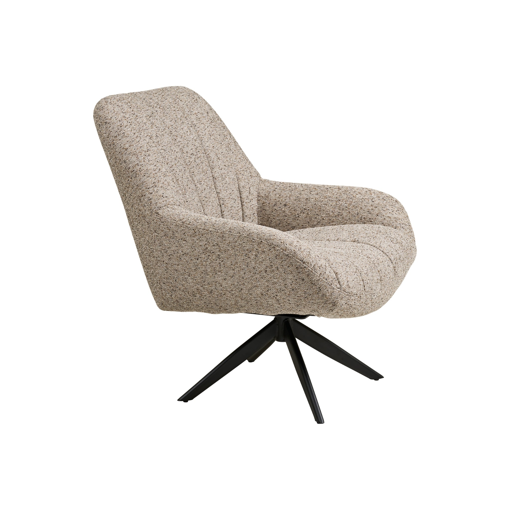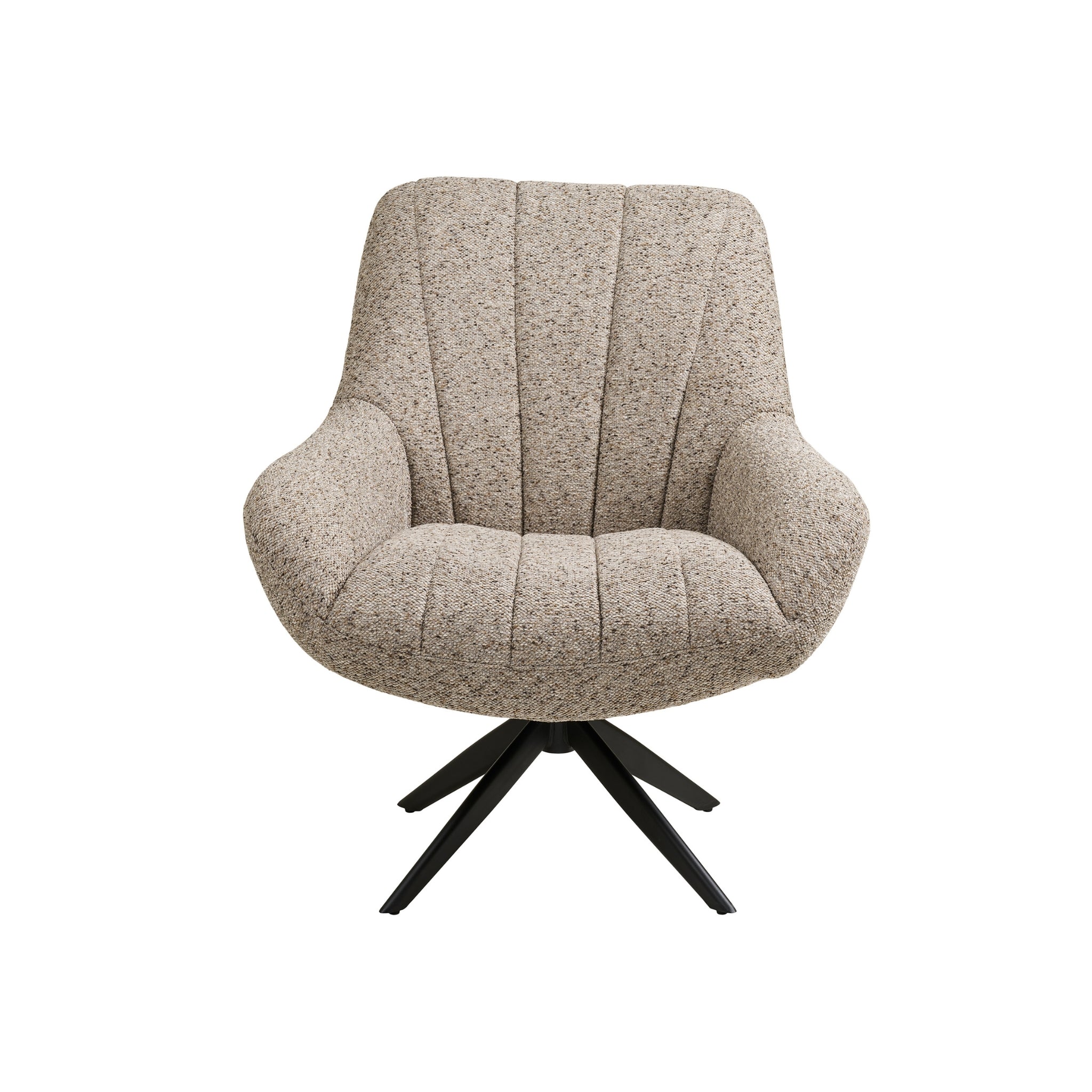 Köp Grandola Fåtölj i grått tyg med svarta metallben. Snurrfunktion, ergonomisk komfort och modern design för vardagsrum och lounge.