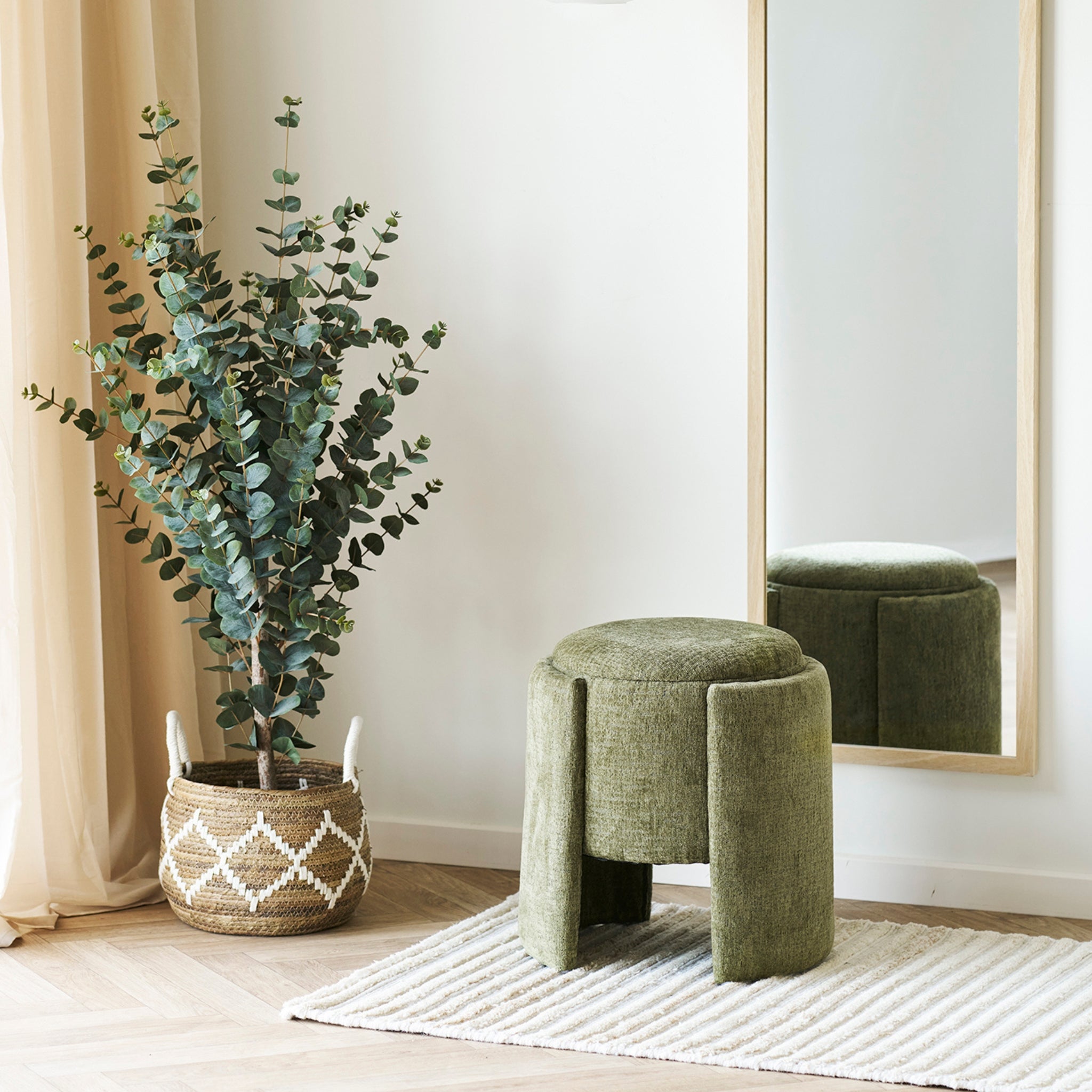 Tillverkad i plywood, skum och tyg, med FSC® 100% certifierat trä, vilket garanterar ett hållbart och miljövänligt val. Puffen har en diameter på 42 cm, höjd på 44 cm och max belastning på 110 kg, vilket gör den både stabil och bekväm som extra sittplats eller fotpall.