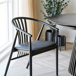 Agustin Matstol är en stilren matstol som kombinerar tidlös design med komfort. Stolen är tillverkad i hållbart bokträ med en elegant svart finish och har en bekväm sits i slitstark PU-läder. Den stoppade sitsen med polyuretanskum ger skön komfort även vid längre middagar.