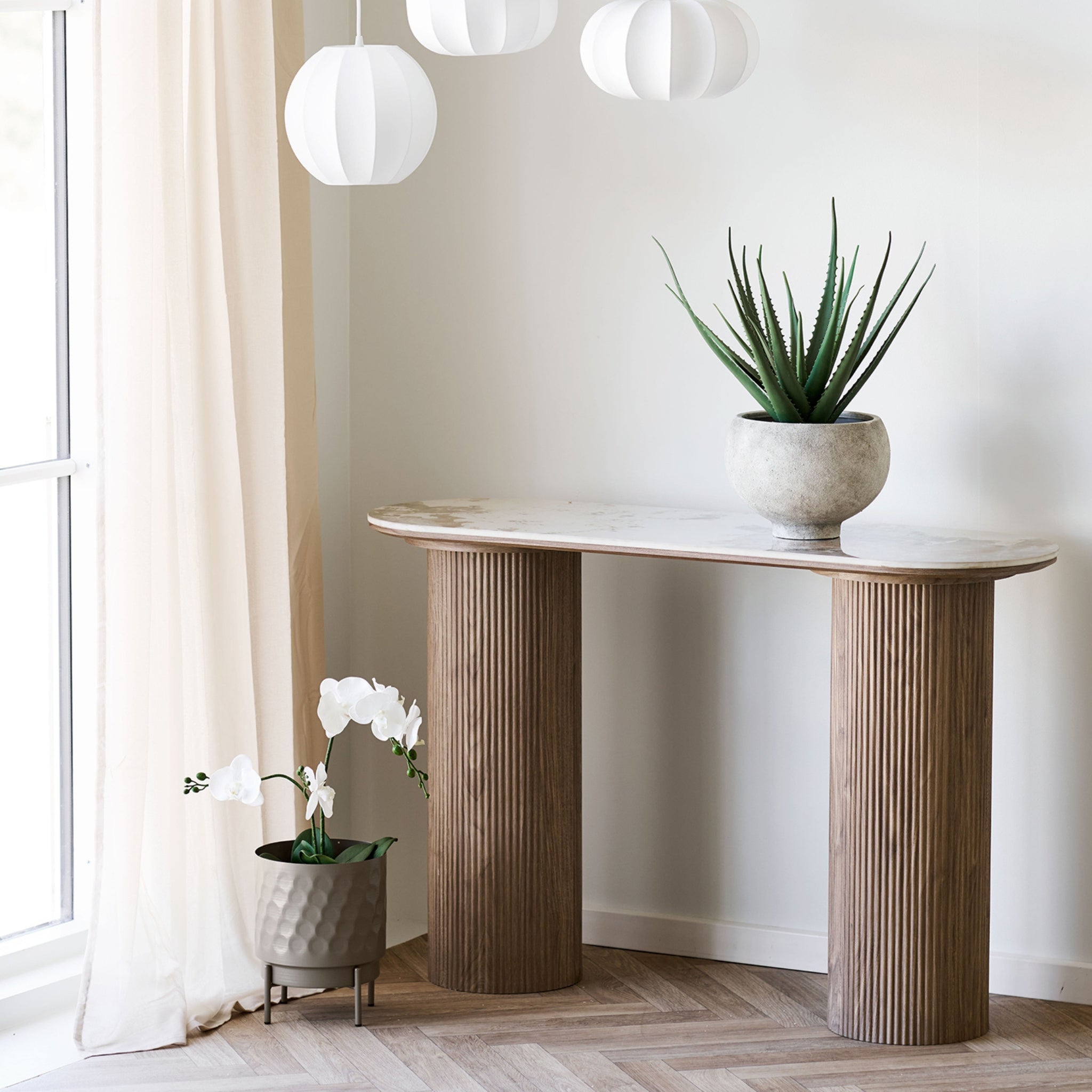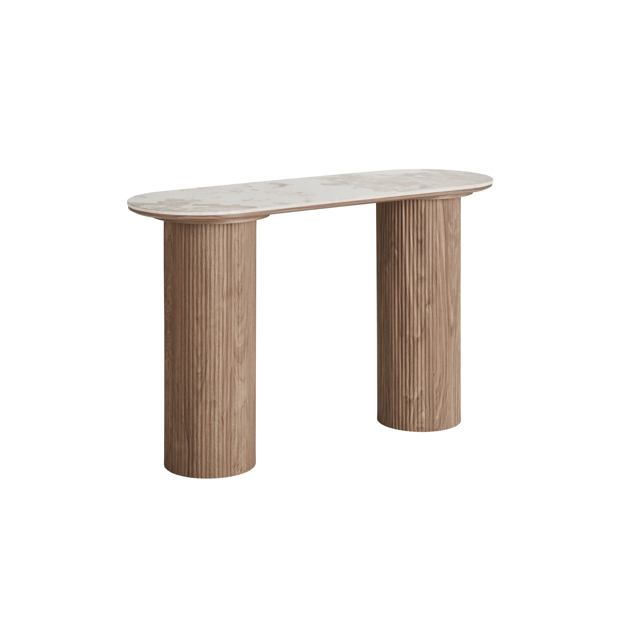 Det stilfulde Athens konsolbord kombinerer et eksklusivt præg med praktisk funktion. Den rektangulære bordplade i hvid keramik giver en moderne og luksuriøs overflade, mens den mørkebrune træbase skaber en elegant kontrast.