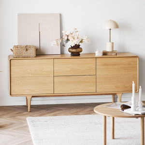 Darwin skænken kombinerer tidløst design med praktisk funktionalitet. Den er lavet med et MDF-kabinet og en massiv egetræsramme, suppleret med egetræsfinerfronter på låger og skuffer. Den naturlige finish fremhæver træets karakter og gør skænken til et stilfuldt møbel, der passer til både moderne og klassiske hjem.