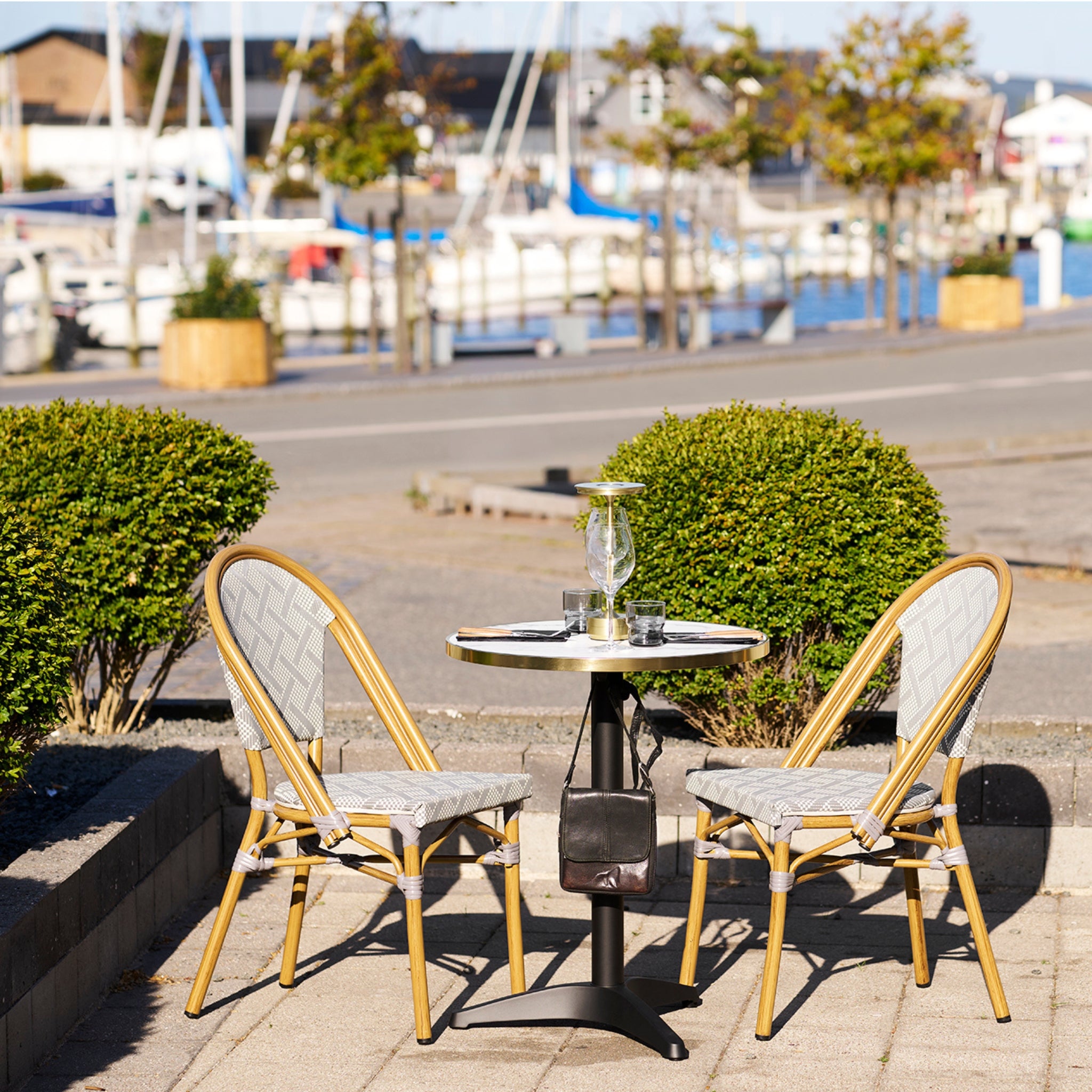 Ge din uteplats, restaurang eller café en elegant touch med Bistro Table, ett stilrent bord med marmormönstrad bordsskiva. Välj mellan rund (ø60 cm) eller fyrkantig (60×60 cm) modell för att passa din inredningsstil.
